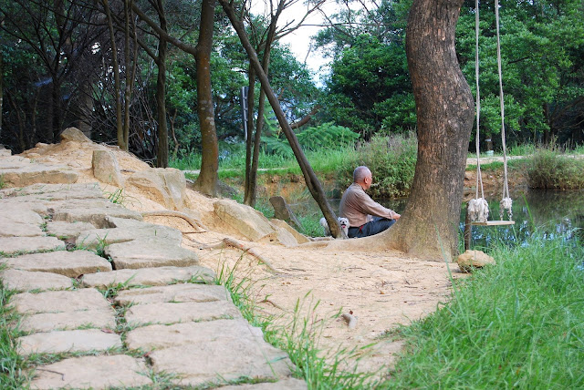 少見的老人與狗,靜靜的坐在一旁,享受著午後悠閒.